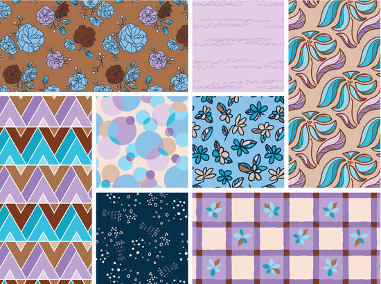 Mabel Jane is feminine but not girly, spunky but not tough, colorful but not loud.This pattern collection would work well on clothing, home goods and stationery.