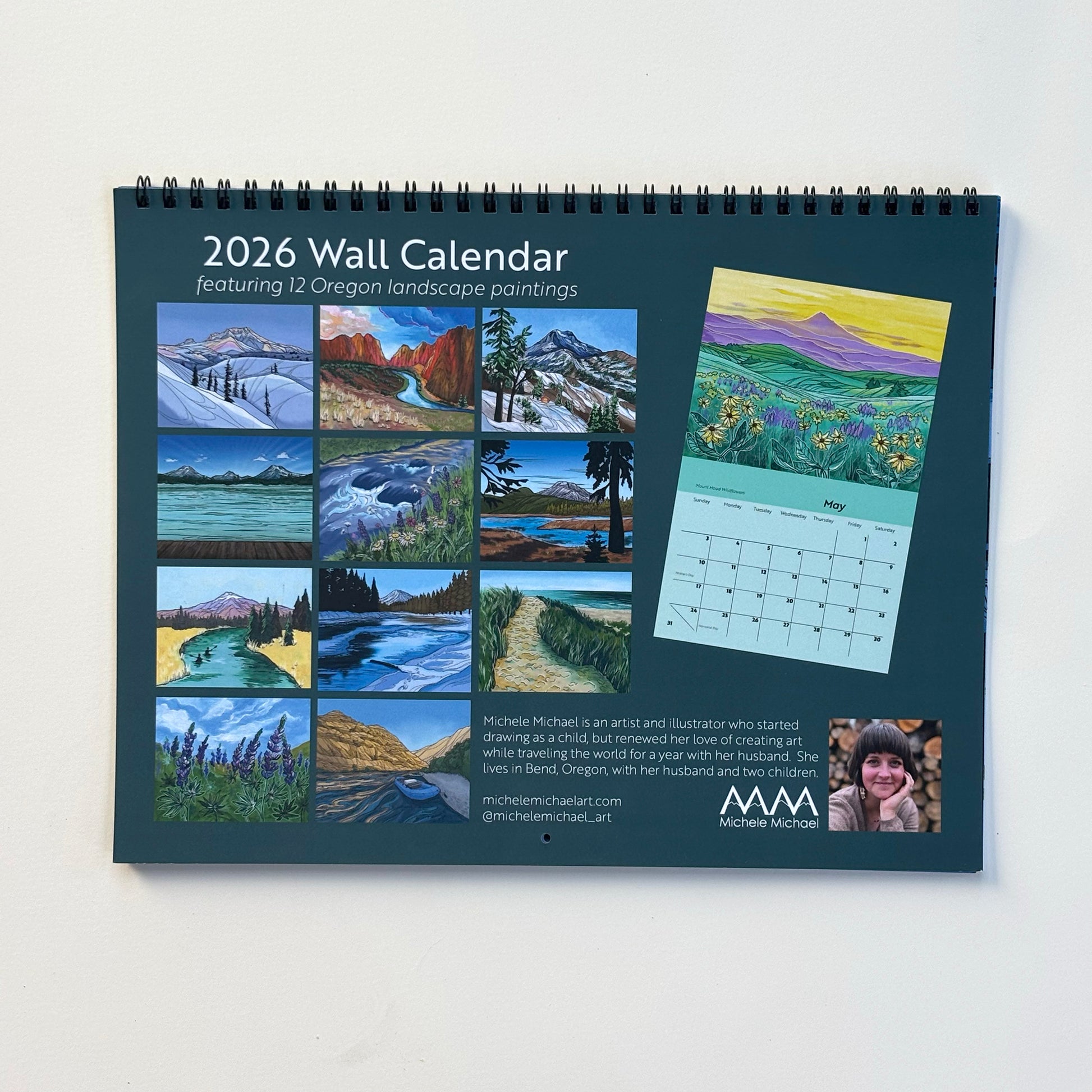 This calendar features 12 Central Oregon landscapes paintings, all originally hand-painted/drawn by Michele Michael. Includes 12 brand new pieces, all created in 2025.