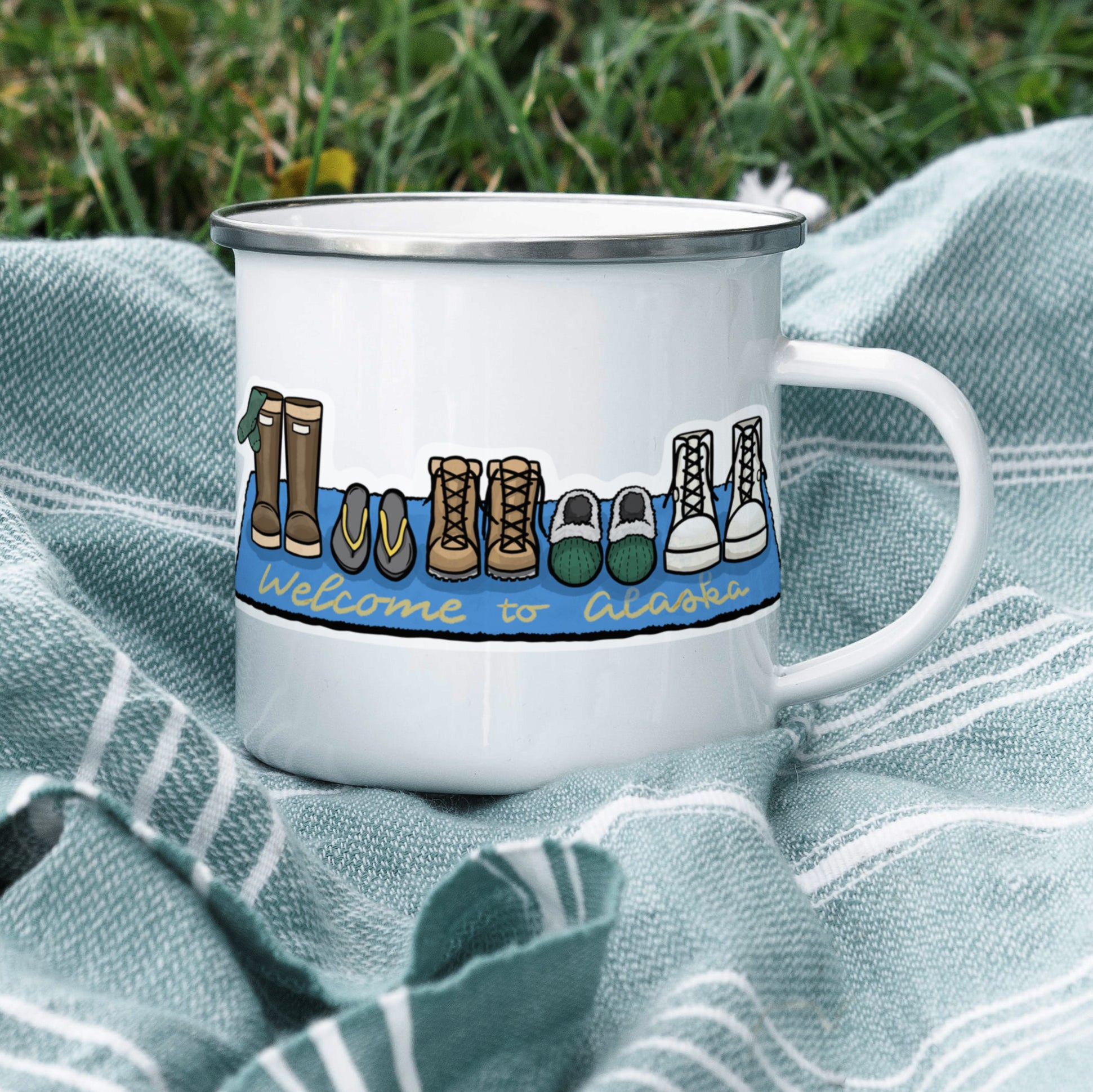 Alaska residents have very specific footwear needs...and iconic footwear! This sticker features rain boots, hiking boots, slippers, flip flop sandals, and "bunny boots."