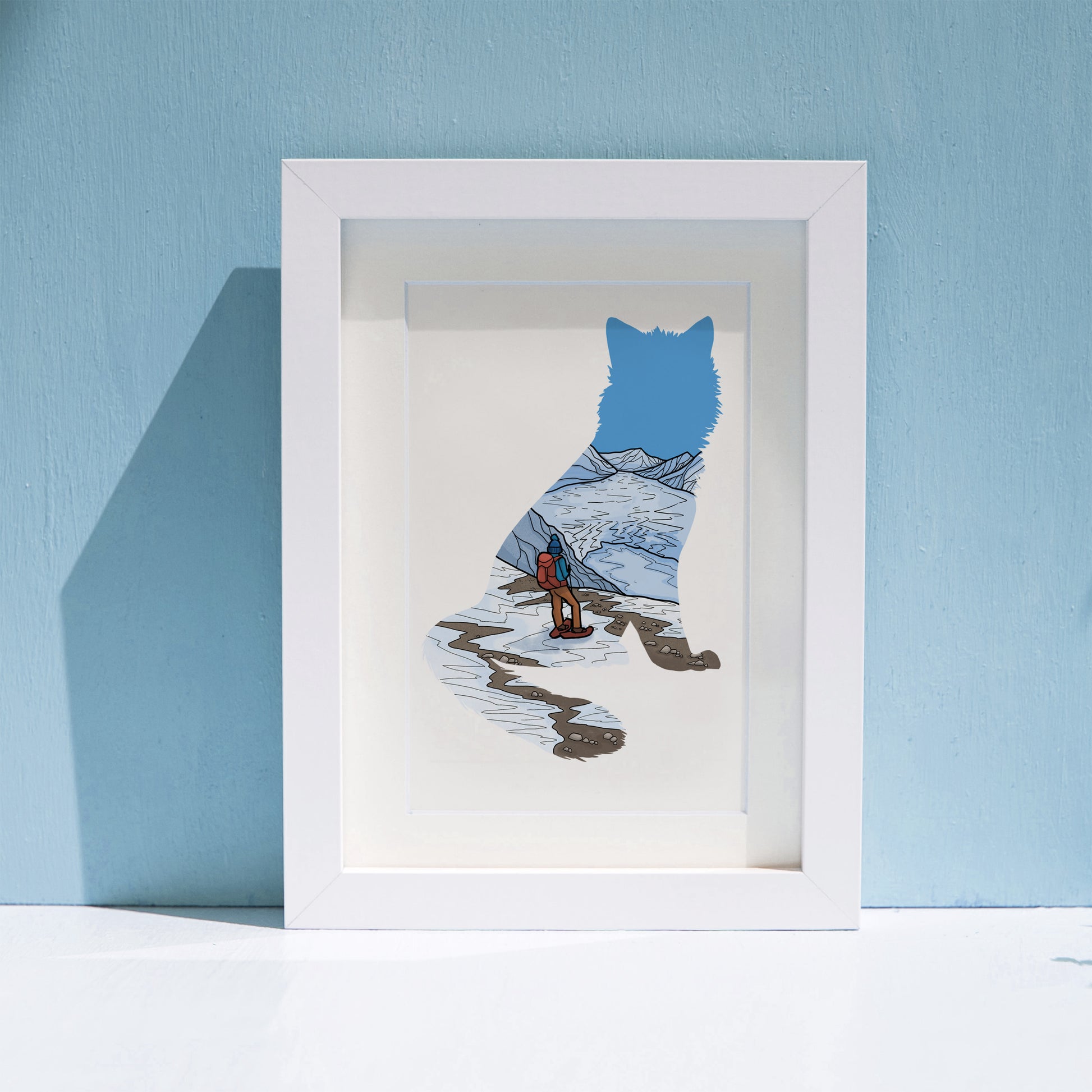 A woman snowshoes along the edge of a cliff overlooking a glacier, outlined in the shape of an arctic fox