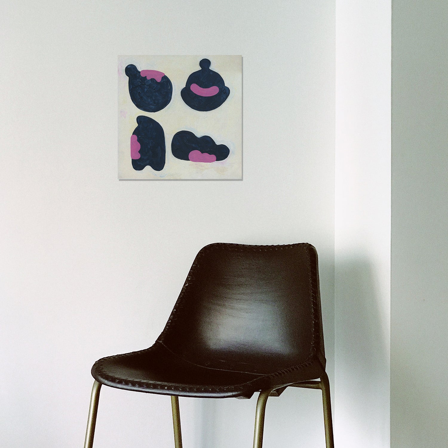 This abstract art piece depicts a mother and baby in four different breastfeeding positions in navy blue and pink.