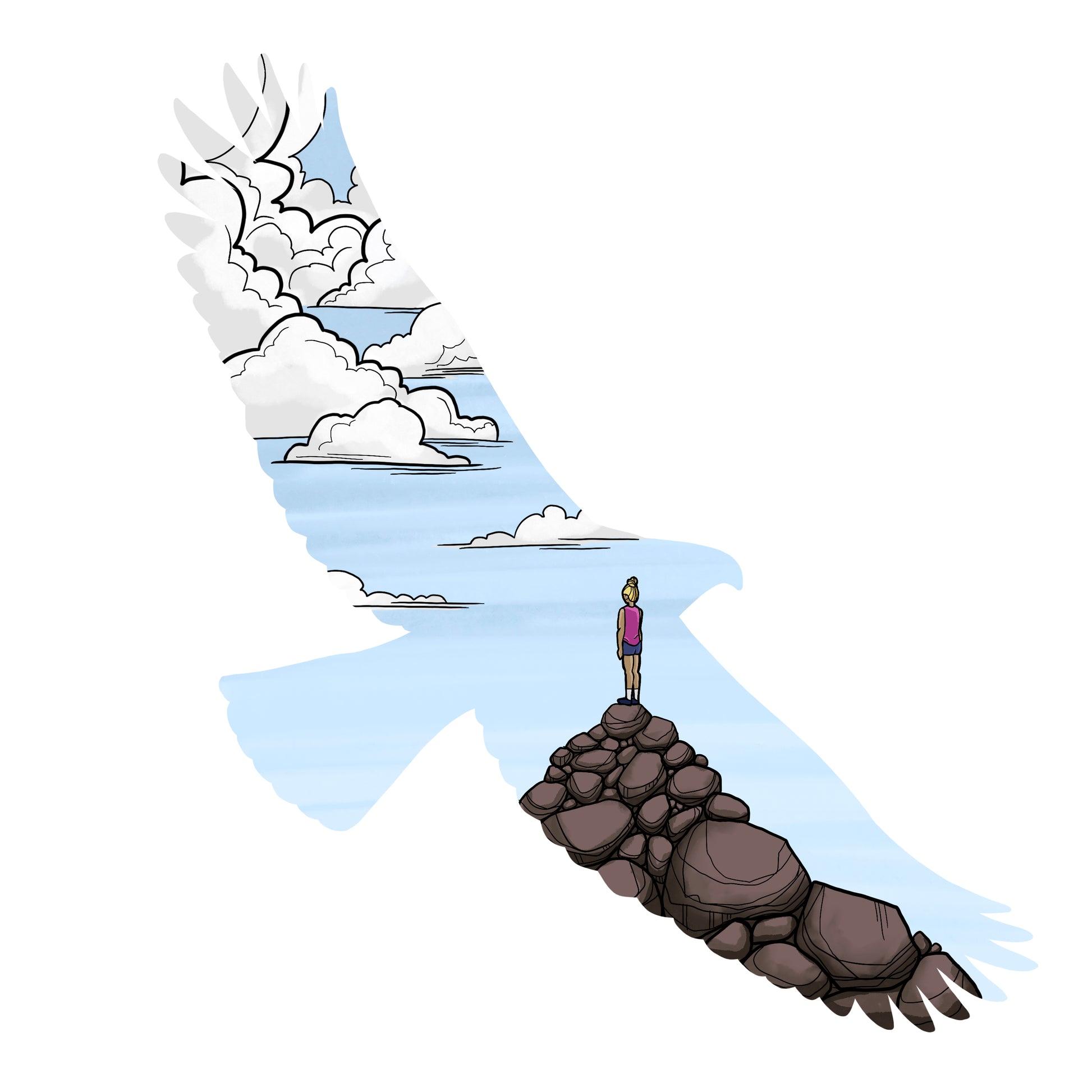 A woman summits a mountain amidst the clouds, outlined in the shape of an eagle.