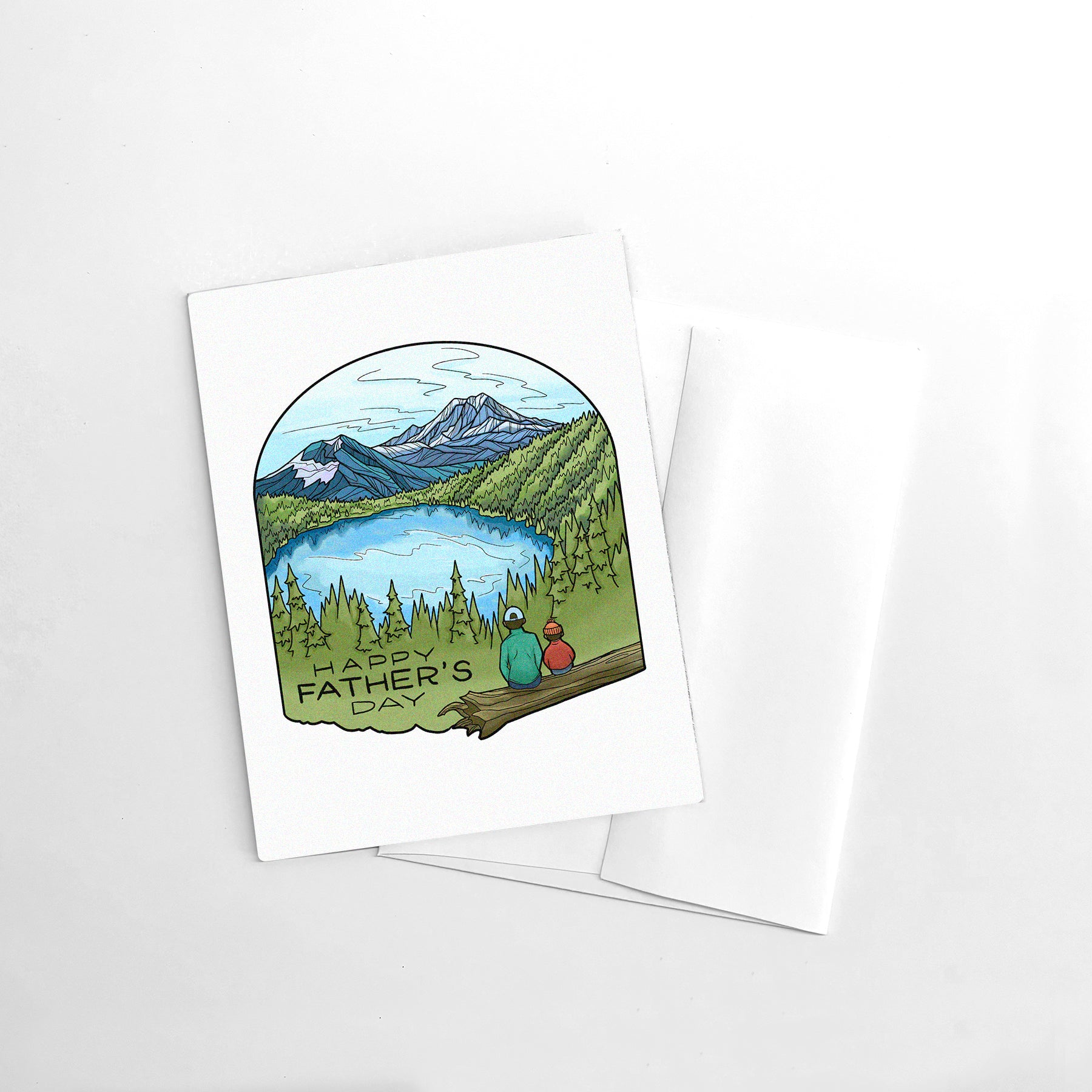Tell your Dad - or father figure - Happy Father's Day with with a beautiful mountain greeting card. Father and son overlook an alpine lake with Mount Rainier in the distance.