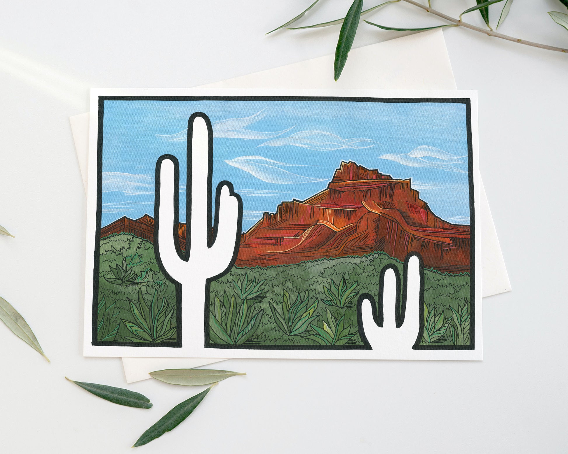 As part of the Lost collection, Lost Saguaro depicts the red rocks and saguaro cacti of the desert southwest.