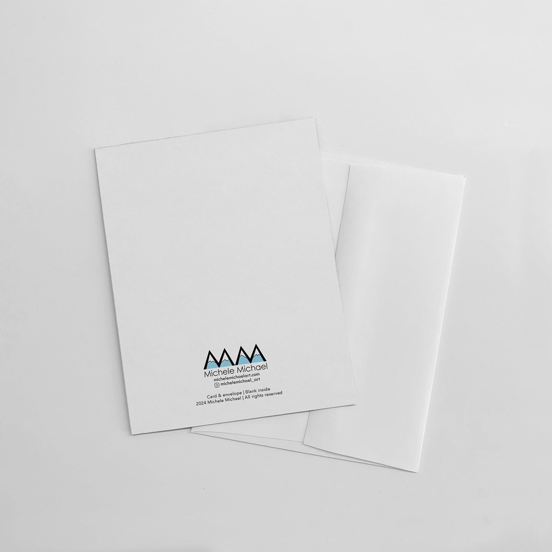 4.25 x 5.5 inch greeting card. Blank inside, white envelope included.