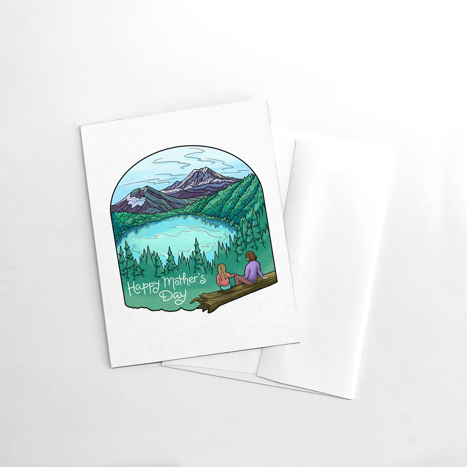 Celebrate your mom with this card of two gals viewing an alpine lake and a beautiful mountain vista.