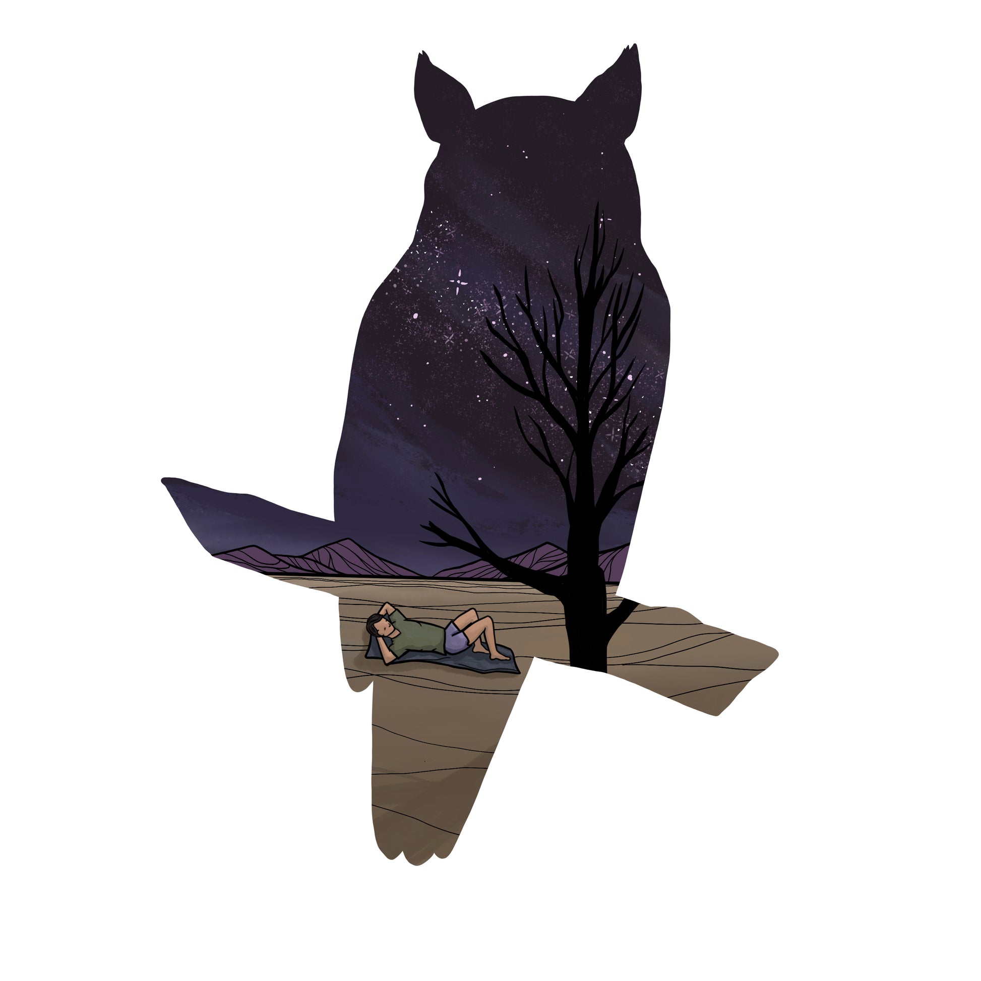 A man rests under the Milky Way stars, outlined in the shape of a Great Horned Owl.