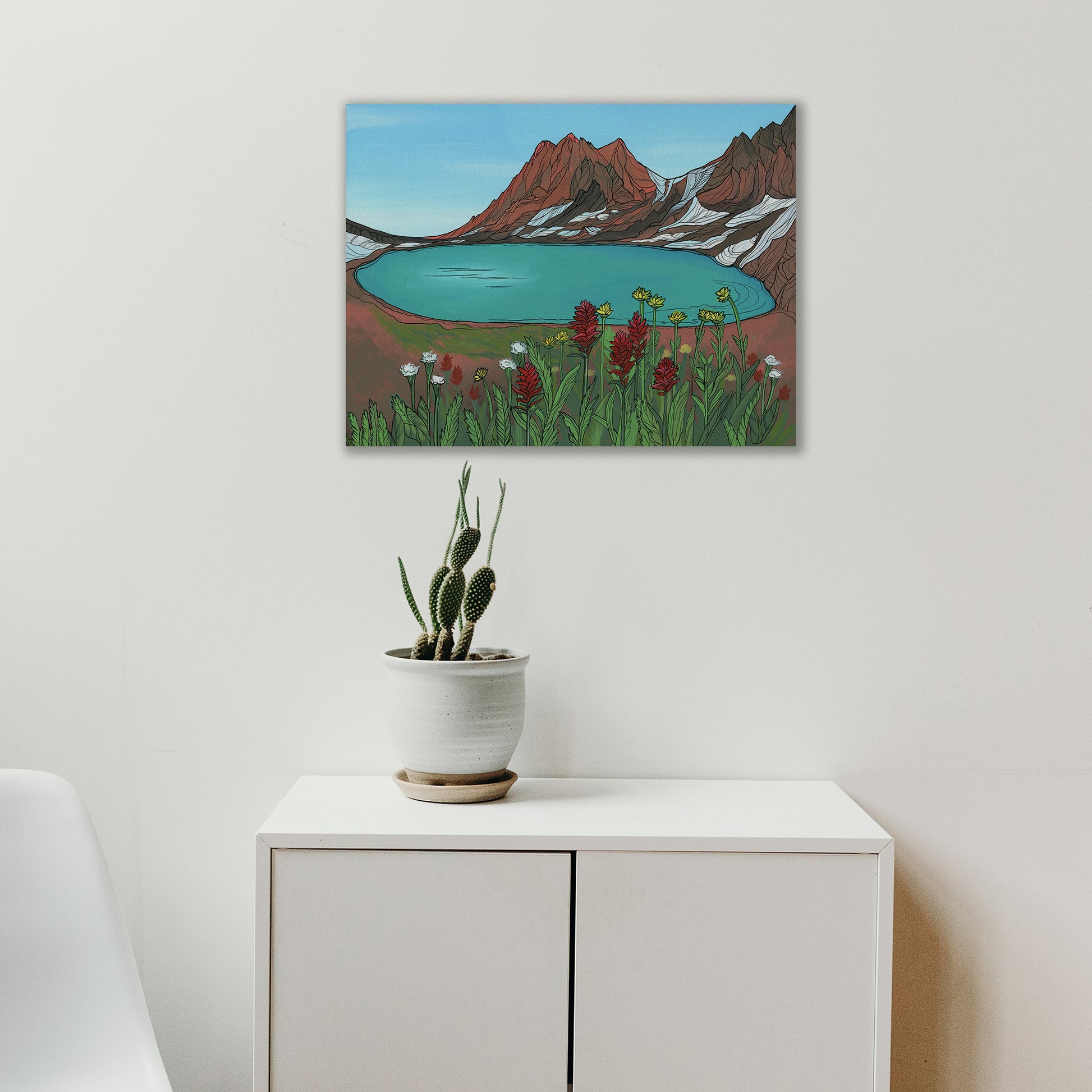 Wild Paintbrush illustrates No Name Lake and Broken Top mountain, situated among the Cascade Mountains close to Bend, Oregon. Flourishing Alpine wildflowers, like Paintbrush, appear within the composition.